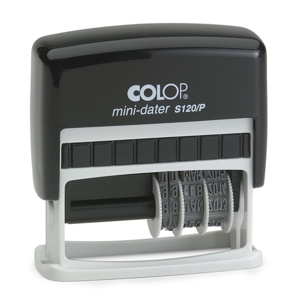 Kompakter Kunststoff-Selbstfärbestempel, dieses Modell enthält 12 klassische Bürotexte und druckt zusätzlich das Datum, Beispielabdruck: BEZAHLT 25. NOV. 2029