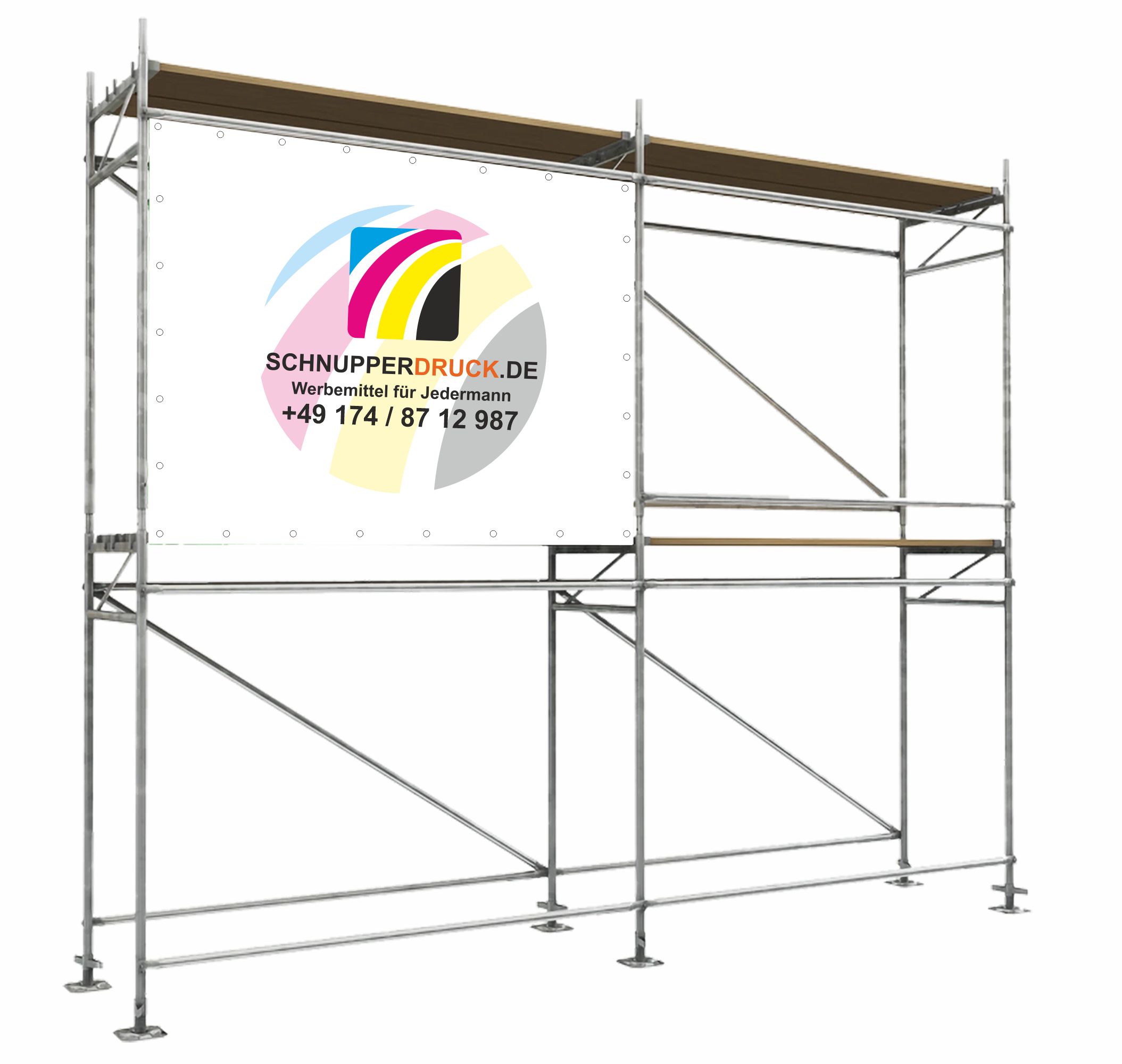 Unser Gerüstbanner ist das ideale Werbemittel für die Nutzung an Baustellen und Gerüsten. Das bewährte PVC-Material widersteht allen Wetterlagen und eignet sich bestens für aussagekräftige Werbung, insbesondere in erhöhten Außenbereichen wie mehrstöckigen Gerüsten. Die Auswahl zwischen den Materialvarianten Frontlit und Mesh ermöglicht zudem eine weitere Anpassung auf die Gegebenheiten vor Ort.