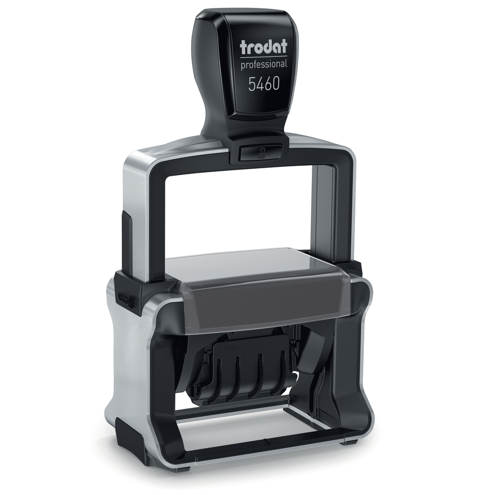 Der neue Trodat Professional 4.0 5460 – Datumstempel + Text, Textplattengröße 55 x 32 mm – max. 6 Zeilen. Der modernste Metallstempel aus Edelstahlt. Die Textplatte ist umweltfreundlich aus lasergraviertem Gummi hergestellt. Sie erhalten das passende Trodat Austauschkissen 6/56 mit Nachkaufgarantie.